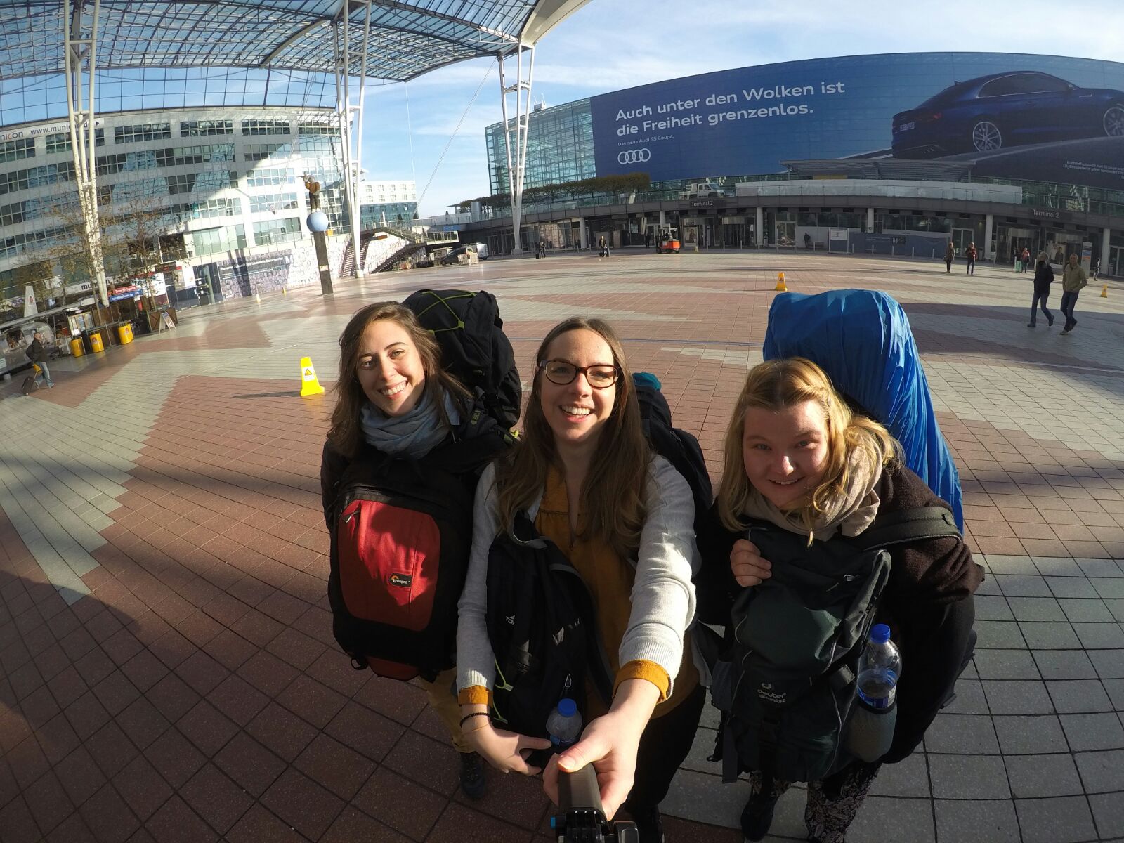 Ahhhh!!1!einself1!! Wir haben es pünktlich zum Flughafen geschafft und starten um 11.25 Uhr in Richtung Mumbai. Und ja, unsere Rucksäcke sind größer als wir 😱😆👌🏽